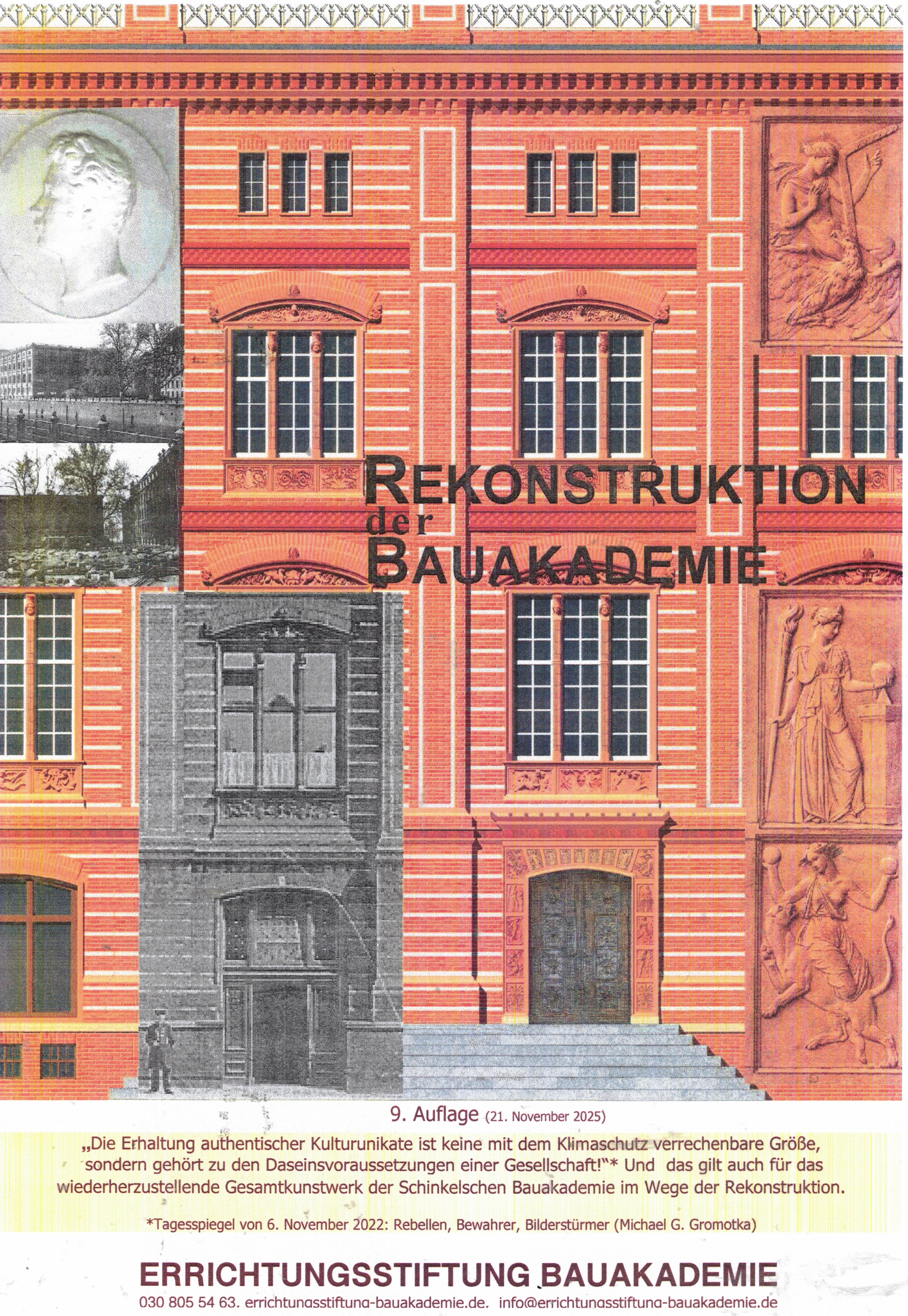 Die Erhaltung authentischer Kulturunikate ist also keine mit dem Klimaschutz verrechenbare Größe, sondern gehört zu den Daseinsvoraussetzungen einer Gesellschaft!“* Und das gilt auch für das wiederherzustellende Kunstwerk der Schinkelschen Bauakademie. Bitte lesen Sie die Broschüre, die von der Rekonstruktion der Bauakademie und der davon abweichenden Vorstellung der Bundesstiftung Bauakademie handelt. Bitte hier anklicken (P d1pdf 3003IV)